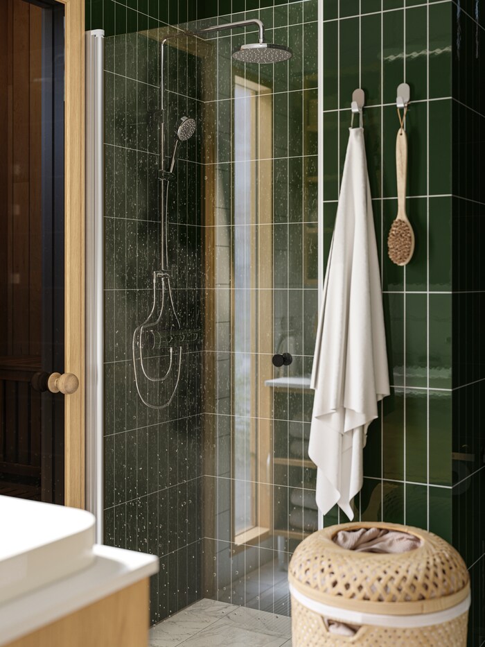 這間小巧的個人浴室裡配置了精巧的照明,當你準備開始新的一天或下班回家準備放鬆時,它都會給你一種身心的享受。櫥櫃、抽屜和開放式架子提供充足的收納空間,而結合橡木風外觀和隱藏式手柄的正面看起來既光滑又時尚,打造出一間非常溫馨的現代優雅浴室。