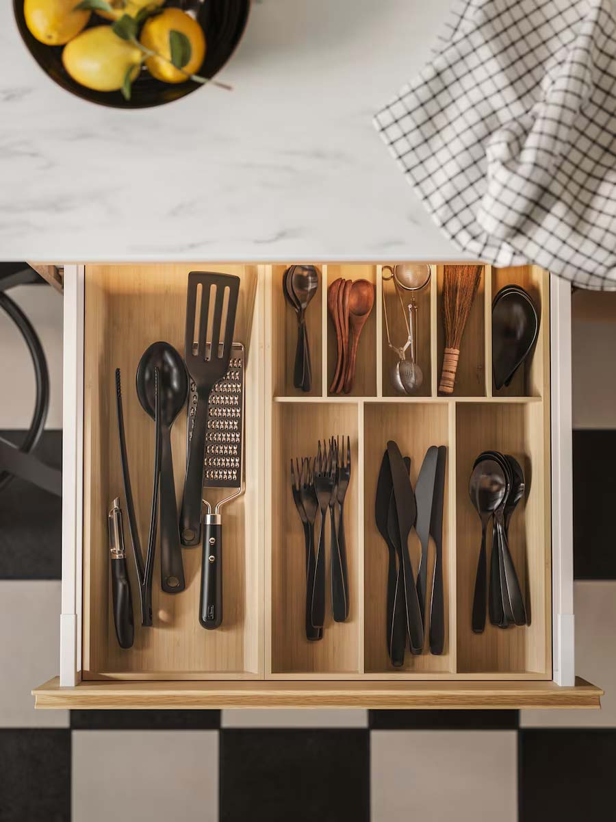 讓烹飪和佈置餐桌變成一種樂趣吧!將餐具和器具整齊地放在廚房抽屜的托盤裡,你就能每次都一眼找到你需要的東西。用抽屜收納盤來管理廚房抽屜,你就可以最大限度地利用空間,同時讓你的廚房工具保持良好狀態。