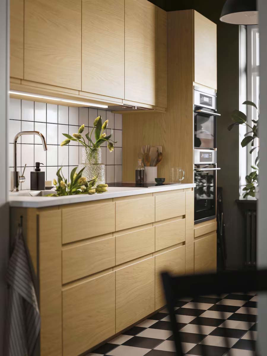 這個小巧但功能強大的並排式廚房非常適合應對繁忙的日常生活,廚房用具都被隱藏在優雅的前板後面,橡木質地的外觀有著溫暖和親切的效果。隱藏式把手充滿現代感的流線型外觀,不止營造出一種寧靜的氛圍,還可以讓你想展示的東西顯得更亮眼。