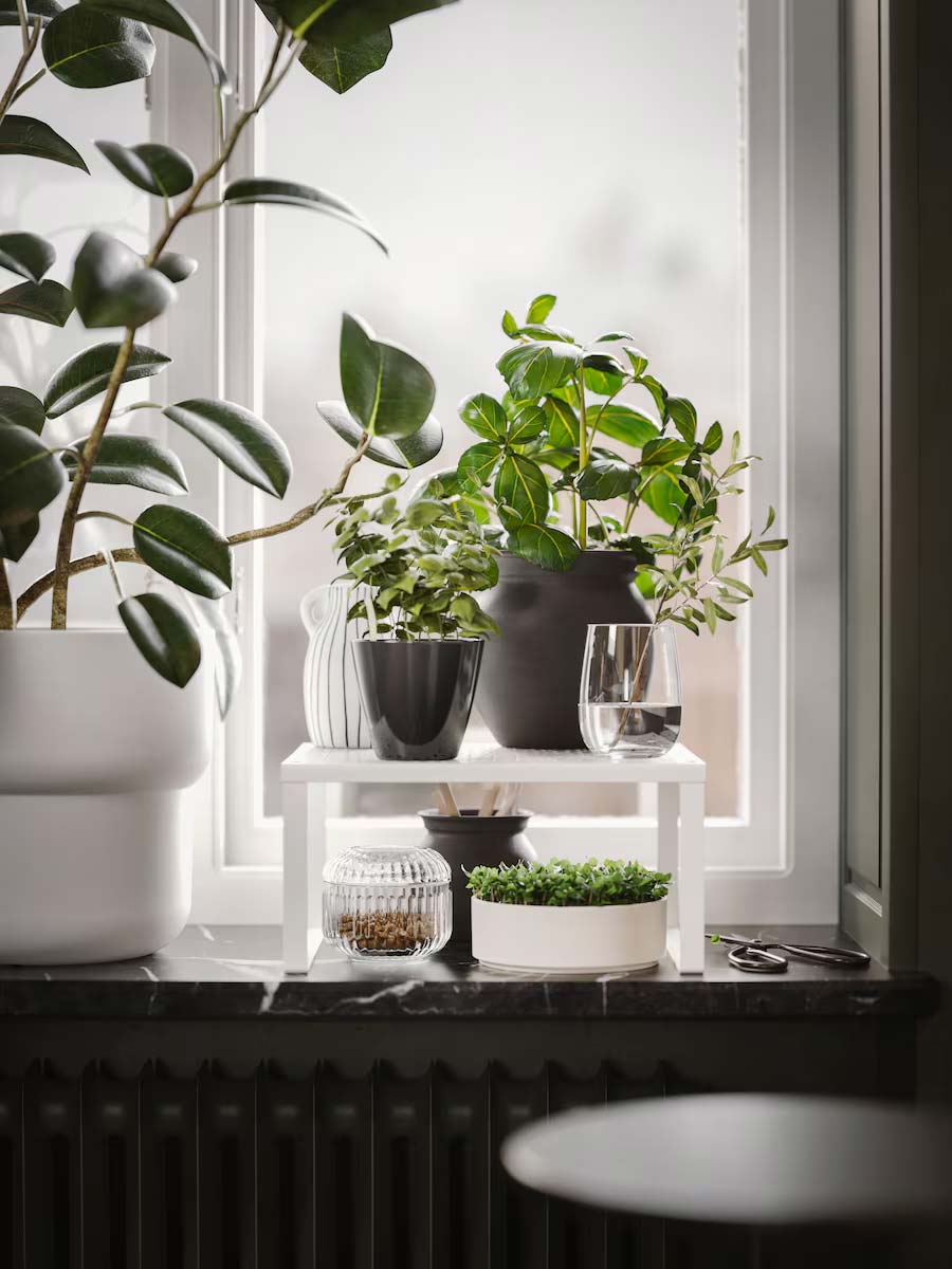 在有訂製工作臺的安靜角落休息一下吧(可調高的凳子在不用時能推進工作臺下面)。上方的淺架不但很適合放置你最喜愛的小裝飾品,還能使工作臺保持整潔,而窗臺上的架子則可以用來種植新鮮香草。