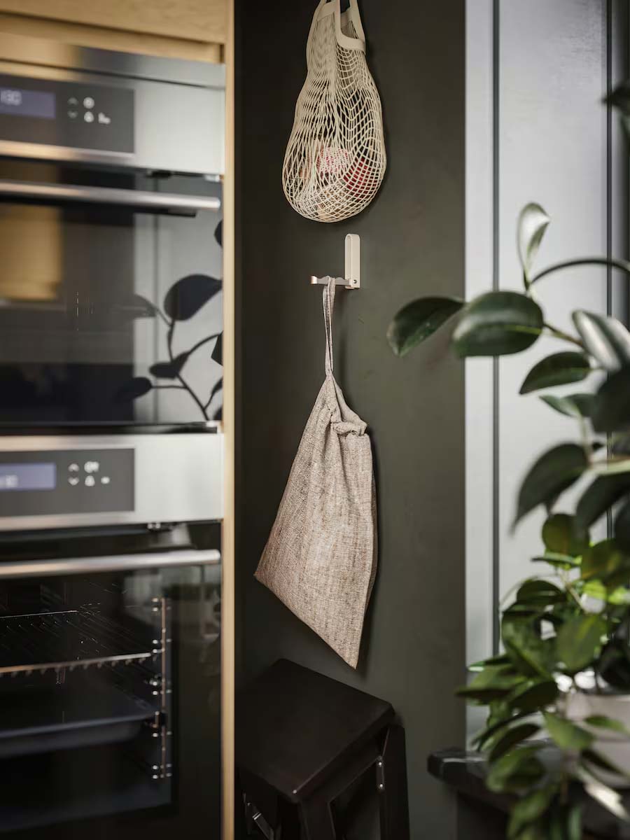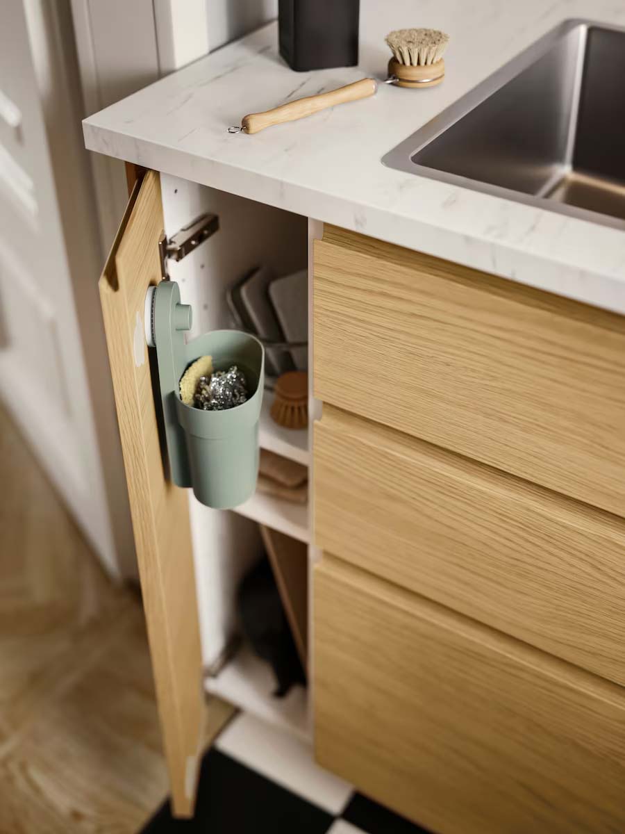 在沒辦法安裝櫥櫃的牆上加個掛勾是個好主意,非常適合放些你想要收好卻又需要隨手拿取的東西。水槽旁的窄櫥櫃很適合放菜瓜布和肥皂,還可以利用無需鑽孔的吸盤容器增加更靈活的收納空間。這是個保持整潔與方便的最佳方案。