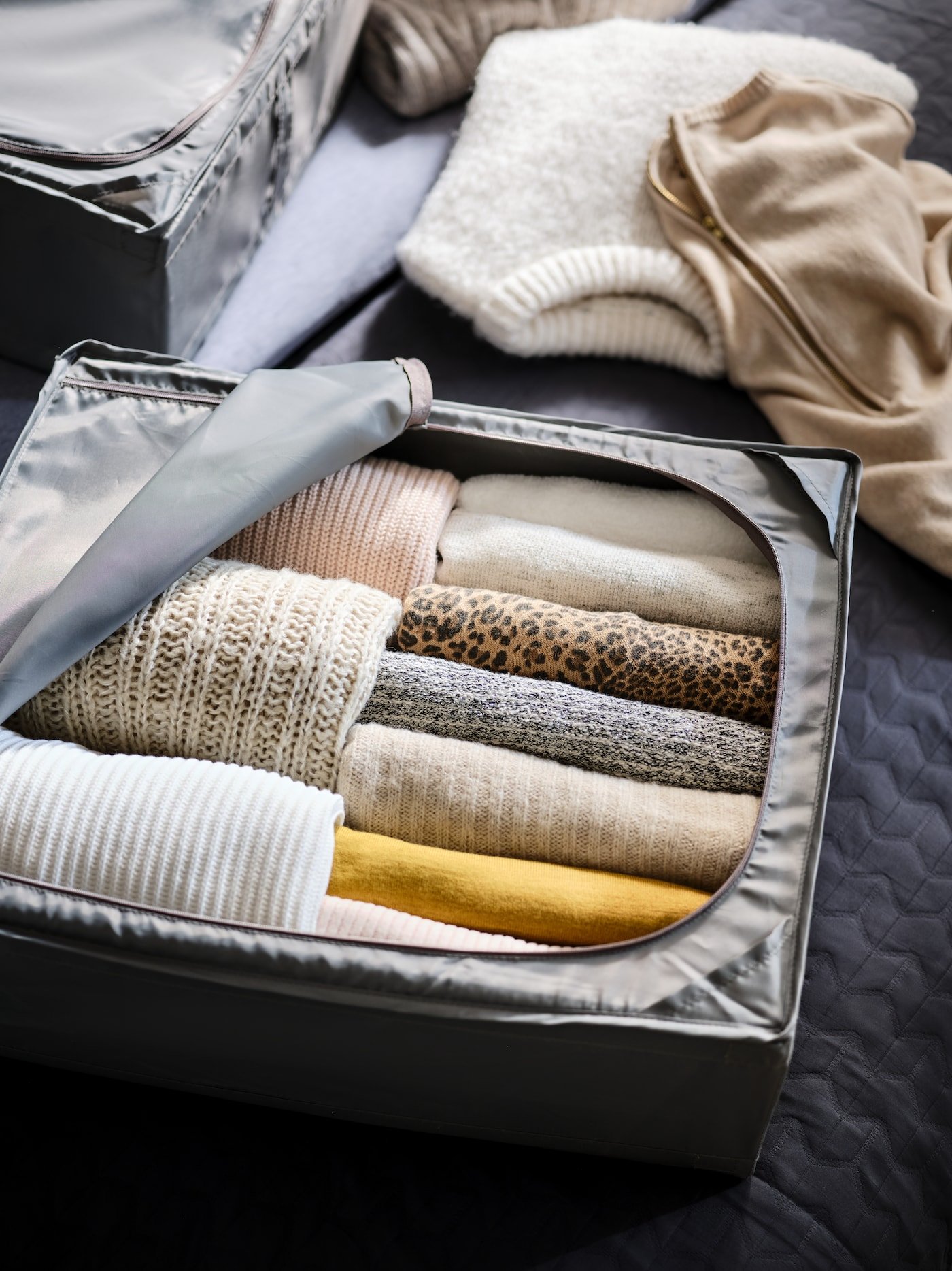 將衣物捲起,是最新的衣物收納妙方。完整利用空間的同時,也能減少摺痕。這個小秘訣不但適合旅行打包,換季時將衣物或寢具放入SKUBB收納盒時也同樣實用。把收納盒放在床下或衣櫃裡,需要時能輕鬆拉出收納盒、取用裡面的衣物。