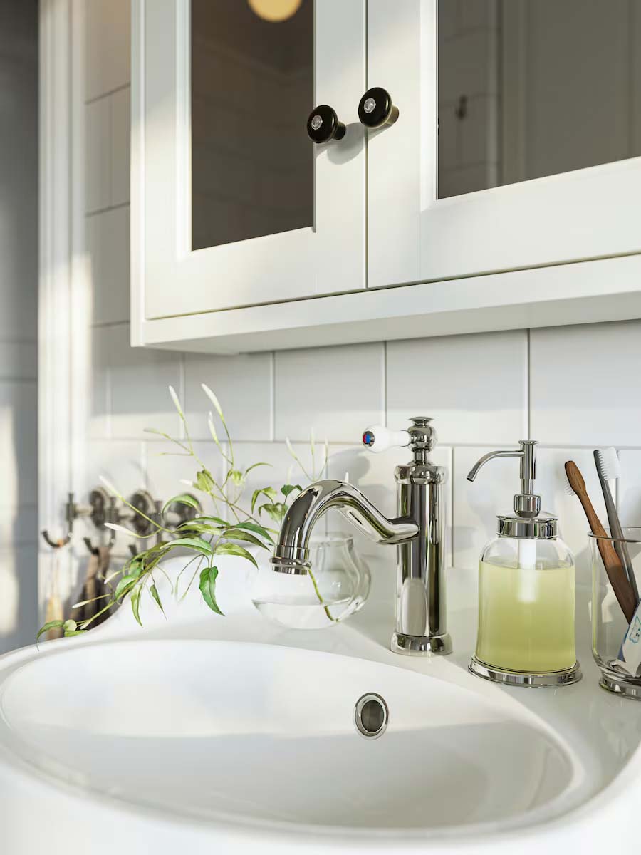 高櫃是這間浴室的主角,它身上包含許多精巧的小細節,如斜面板、不銹鋼腳和消光黑把手。你可以在架子上展示最愛的東西,在增添個人風格的同時讓其他用品也井井有條。