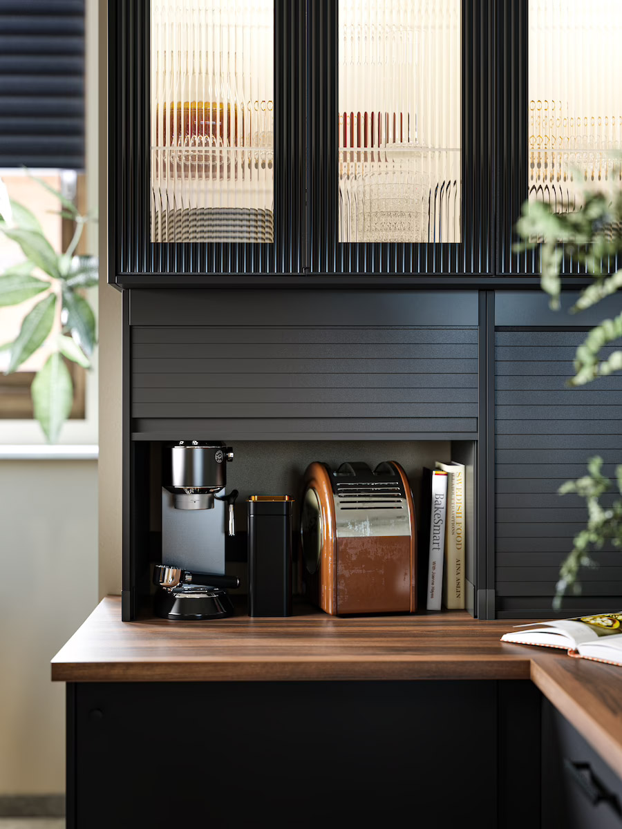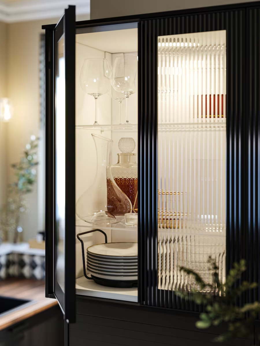 收納方式結合實用功能與個人風格。捲頂式收納組合就像玻璃門收納櫃一樣,能藏起物品或展示珍藏,適合擺放常用電器,或是心愛的酒杯、碟子和花瓶。