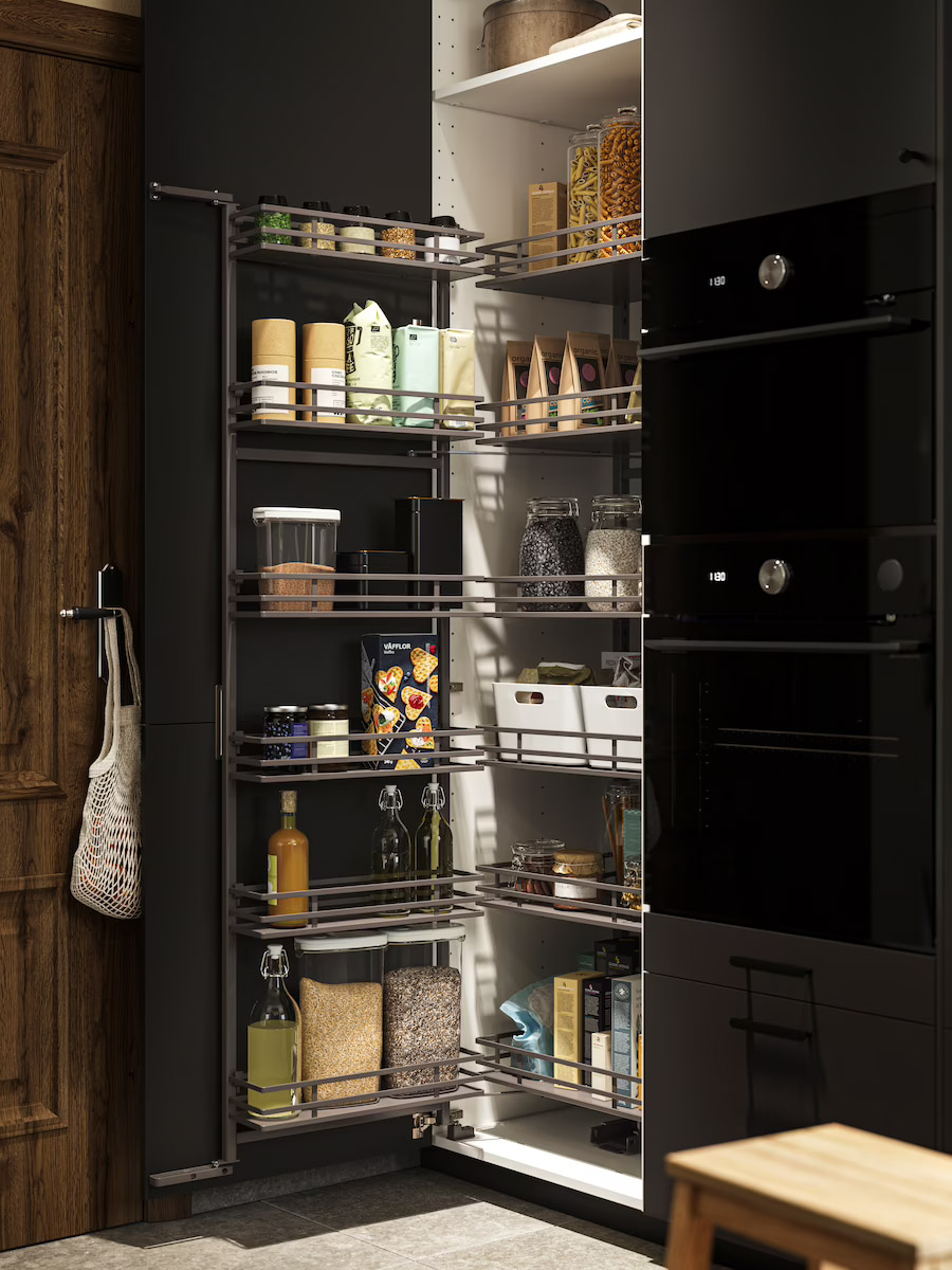 從罐頭、瓶子、食物盒以至興趣用品,拉出式食品儲藏櫃確保一切都近在手邊,也能配合不同的需要。方便的檯面可以用來準備食材,也是寫作、插花或創作的空間。