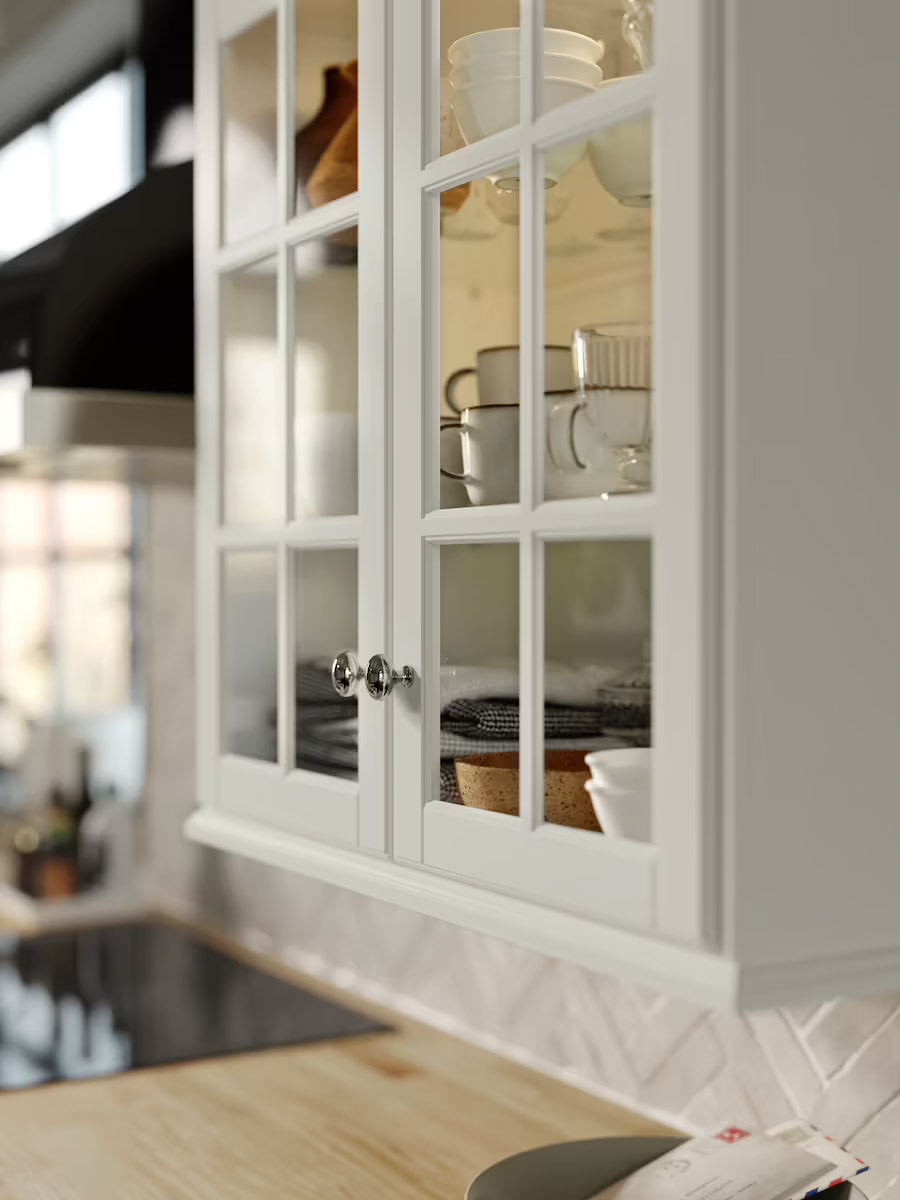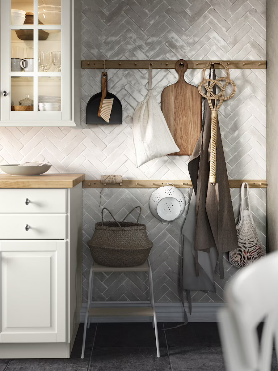 這個集客廳與廚房於一體的空間全方位照顧家裡各人的需要。附有掛鈎的牆架方便各人取放物品,在較低位置安裝一支掛桿,小孩子也能輕鬆使用。玻璃門收納櫃不但展示精湛工藝,也能保護心愛物品以免受損。