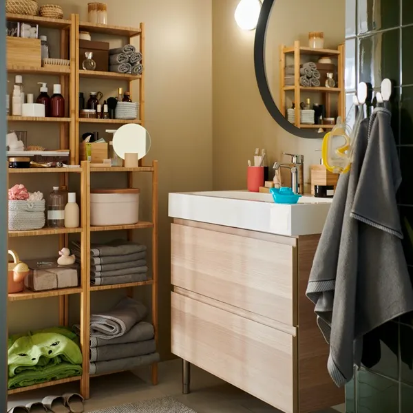 開放式層架,讓所有物品一目了然,適合擺放香水瓶或其他常用物品。在浴室空間有限下,善用浴室推車,不須另外裝潢,也能輕鬆收納大小物品,也方便移動取用。IKEA提供浴室各種配件,像是掛勾、毛巾架、肥皂架、牙刷杯等,讓你每天的梳洗打扮更從容自在。