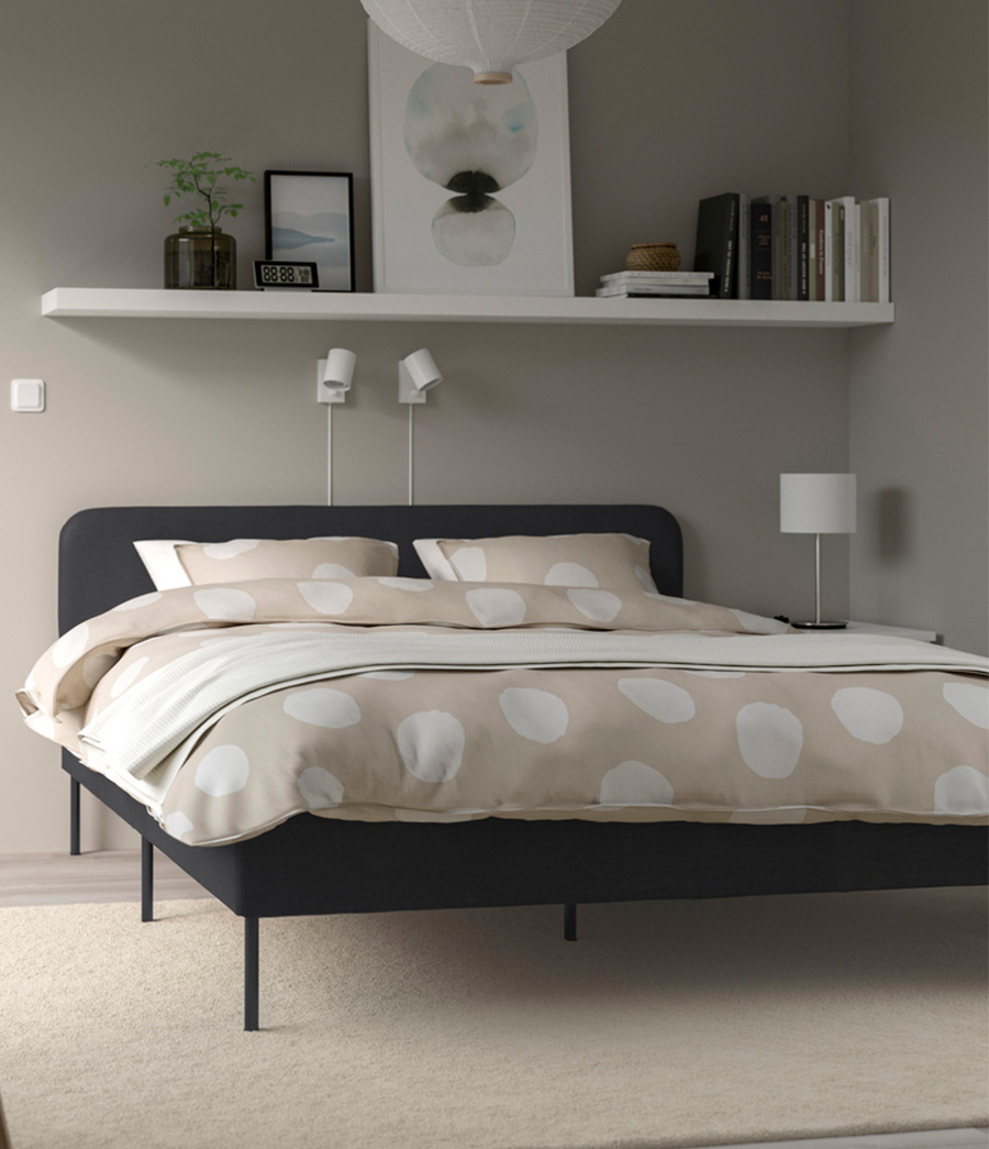 全新 TÄLLÅSEN 軟墊床架為臥室帶來更細緻的迷人享受。簡潔線條、細緻霧面金屬床腳和軟墊床頭板,讓床架本身就令人驚艷。床罩可輕鬆拆卸清洗,隨時保持光潔如新。