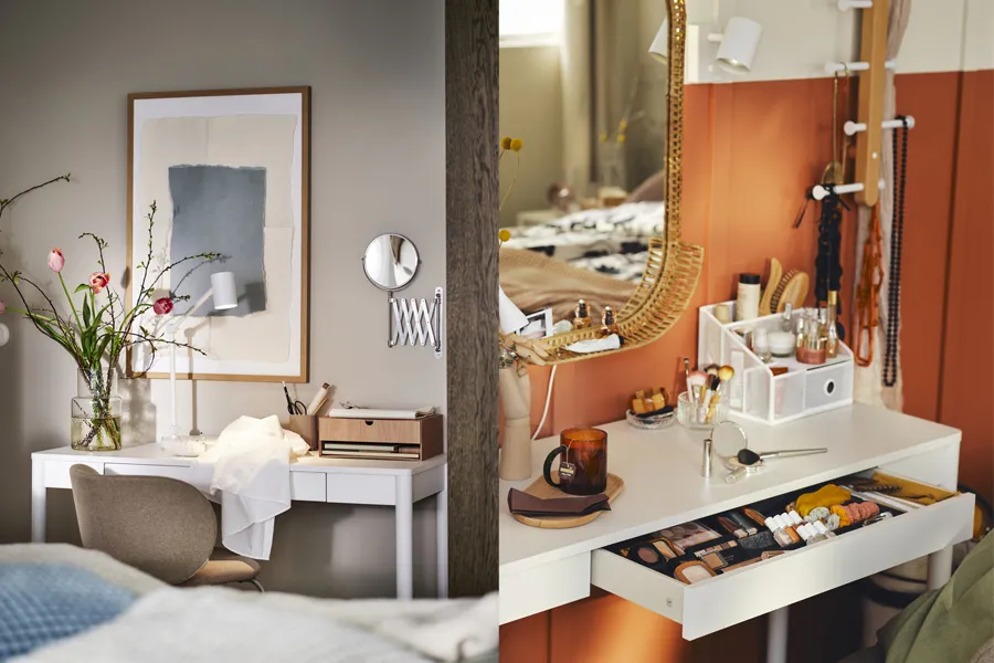 當所有的美妝與保養品都妥善收納並隨手可得,睫毛膏、唇膏就利用儲物盒分類整理,首飾與指甲油依顏色與風格收好;裡外空間都賞心悅目,你就有可以享受更多保養與上妝的個人時光!