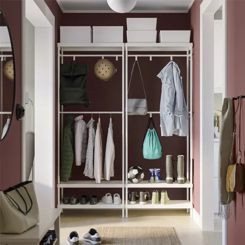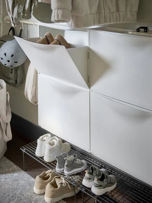 抽屜和附可調式層板的開放式儲物隔層,適合放鞋子、提袋和配件,兼具開放和隱藏的儲物方式,可隱藏或展示物品,提供足夠空間放置帽子、手套、袋子及存放衣物清潔用品等小物的收納盒。
