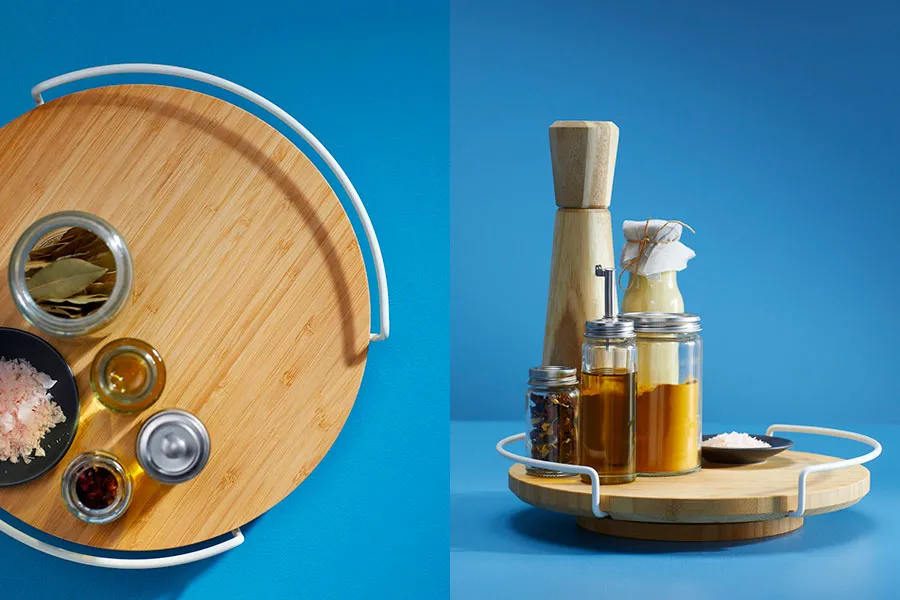 全新的APTITLIG轉盤相當實用,可用於裝飾、收納或整理調味料。旋轉功能和低調的把手讓每位用餐者都能輕鬆拿到他們最愛的調味料或菜餚。