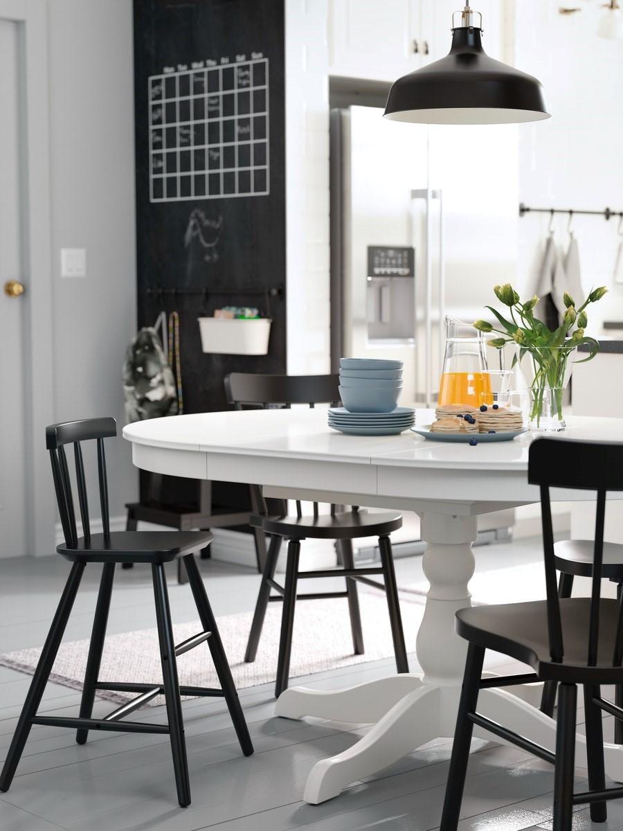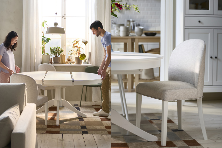 IKEA有各種不同尺寸的餐桌,1到8人坐的餐桌都有。其中多款餐桌有外拉式、延伸式或折疊桌板,拉開就能讓桌面變大,以符合用餐的需求,且讓居家生活更有彈性。選擇不同的餐椅也能改變整個空間感受,還可以依個人喜好搭配。