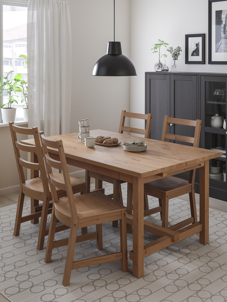 NÄSINGE 餐桌搭配實木貼皮桌面與斜切邊實木桌腳,視覺沈穩且細節講究。可延伸設計讓座位輕鬆從 4 人擴充至 6 人,無論日常用餐或朋友聚會都能輕鬆應對。