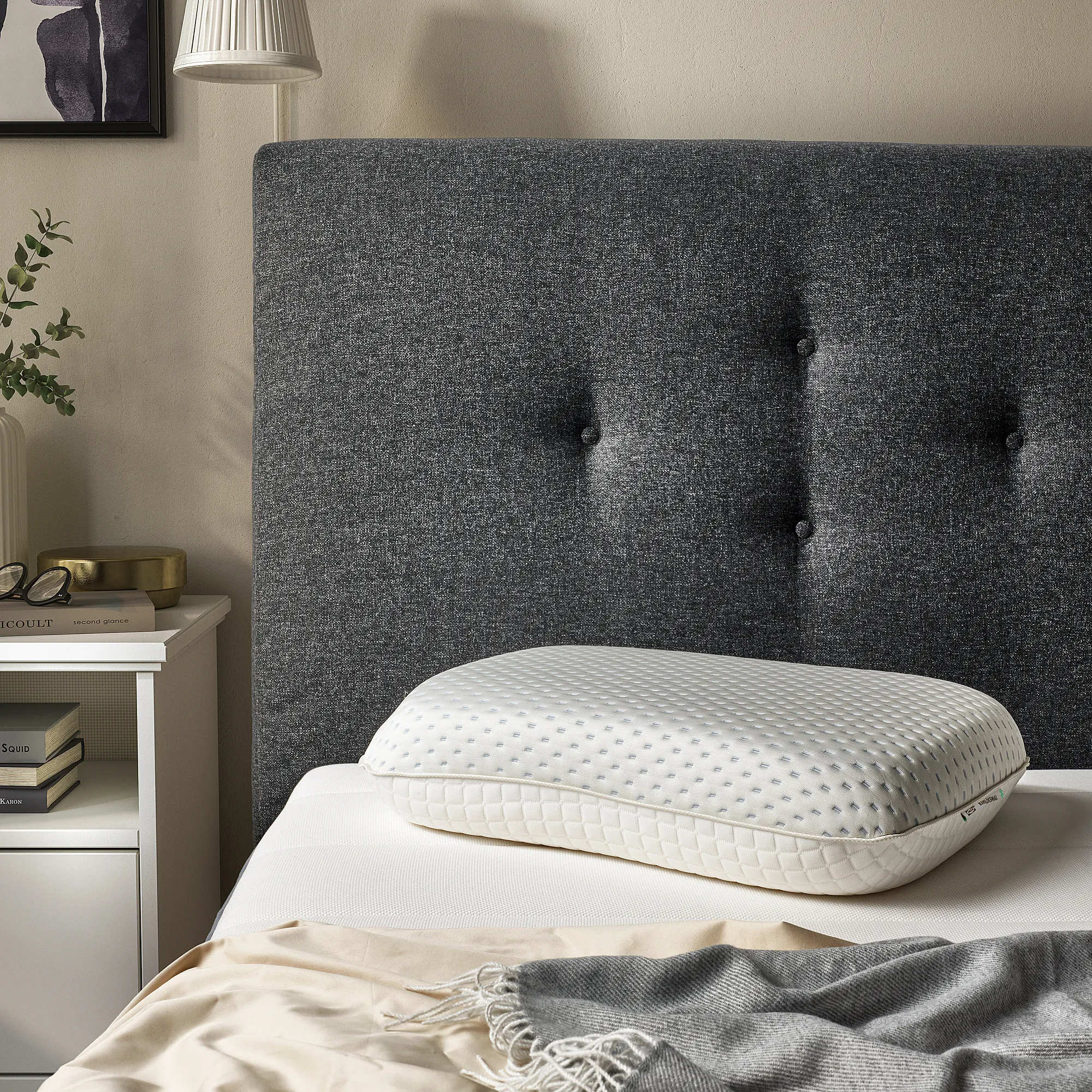 天然透氣乳膠材質可防螨抗菌,且乳膠製枕頭形狀緊貼頭形,提供良好支撐及減低肩頸壓力