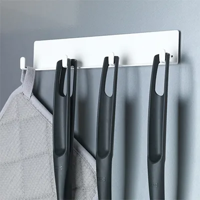 將磁吸的掛鉤架吸附在推車上,可掛上廚巾、隔熱墊或餐具用品。
