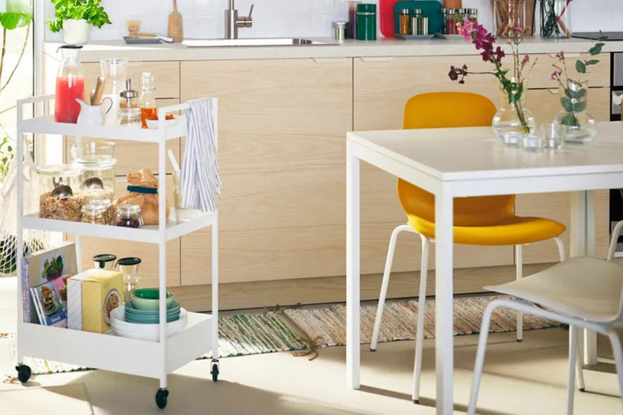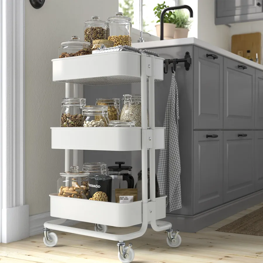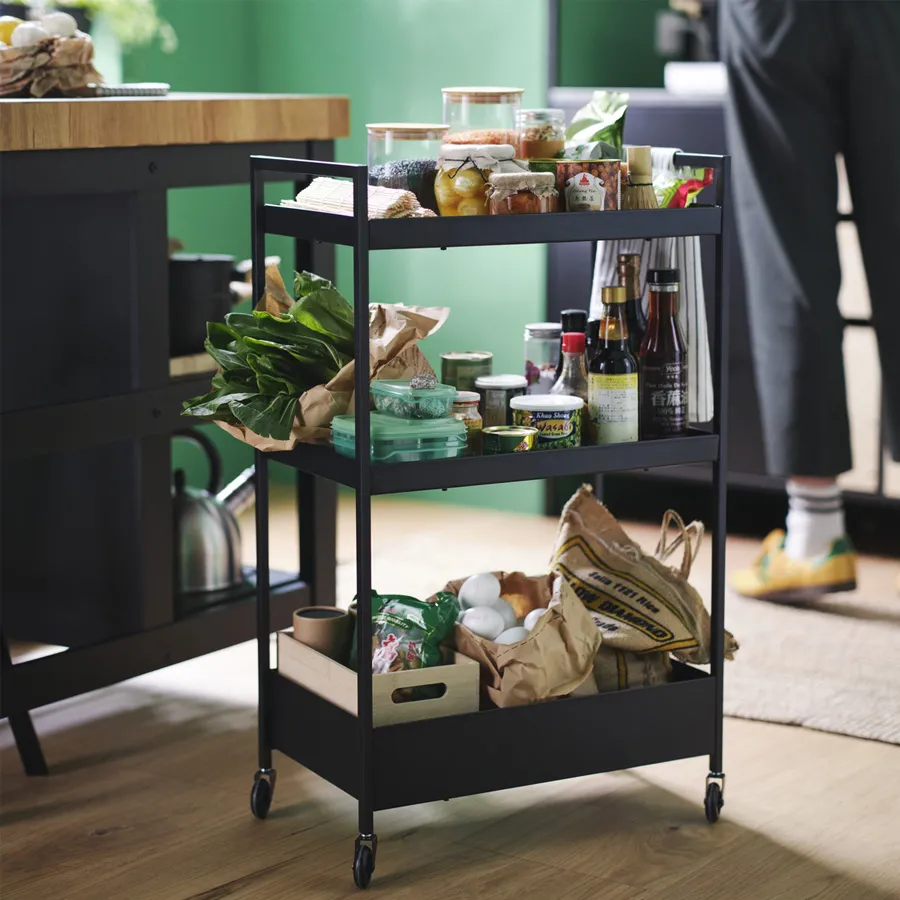 使用IKEA 365+密封保鮮罐保存水果、乾食材或零食,並將其收納在推車上,方便隨時取用。