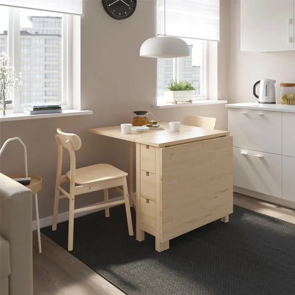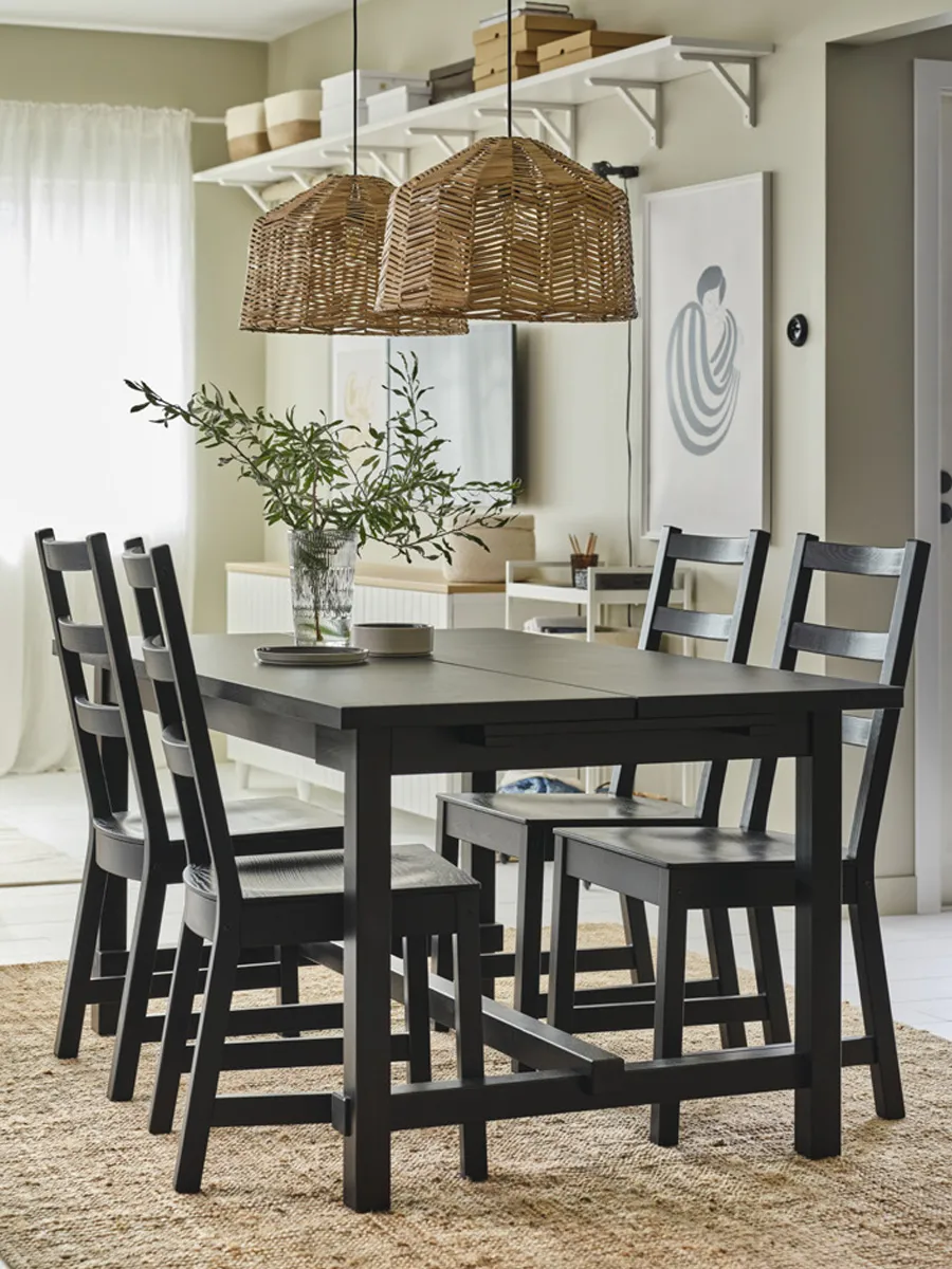 NÄSINGE 餐桌搭配實木貼皮桌面與斜切邊實木桌腳,視覺沈穩且細節講究。可延伸設計讓座位輕鬆從 4 人擴充至 6 人,無論日常用餐或朋友聚會都能輕鬆應對。