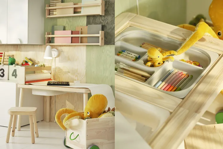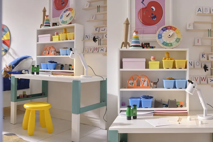 激發創意的書檯 無論孩子喜歡畫畫、填色或做手工,一張專屬的書檯也能鼓勵他們盡情發揮創意。在附近設置層架和儲物盒,就能確保文具、玩具和其他用品井井有條,伸手可及。盡量將儲物用品變得更時尚和具啟發性,成為孩子的靈感泉源。