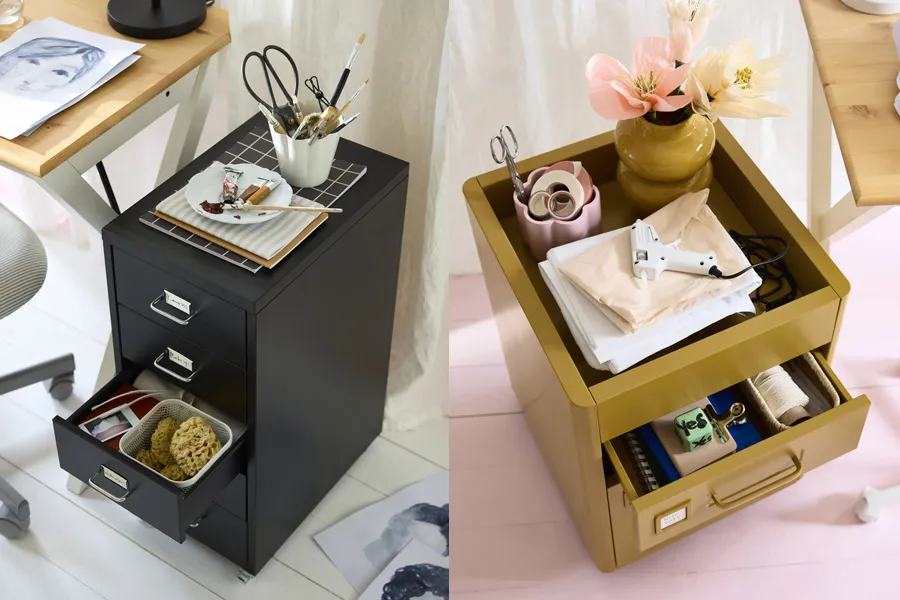 想為家尋找適合的抽屜櫃?各種不同外觀和顏色,都能在 IKEA 找到。附輪腳的抽屜櫃能視需求推到想要的空間,改變心意時輕鬆就能移開。