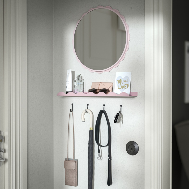 每天早上的梳妝時間,值得擁有更甜美的視角。粉紅波浪邊框為你的倒影鑲上浪漫,隨手從下方的壁架拿起香水,在最愛的鏡子前,完成你最自信的樣子。