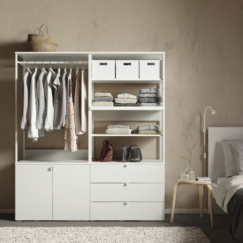 價格親民、靈活堅固的落地式收納組合,能輕鬆安裝於臥室、衣櫃或玄關,適用於室內潮濕的地方。部分櫃框/組合可以堆疊或加裝輪腳。主要尺寸: 寬25或50公分;高70公分(一個櫃框的高度為104公分);深51公分。