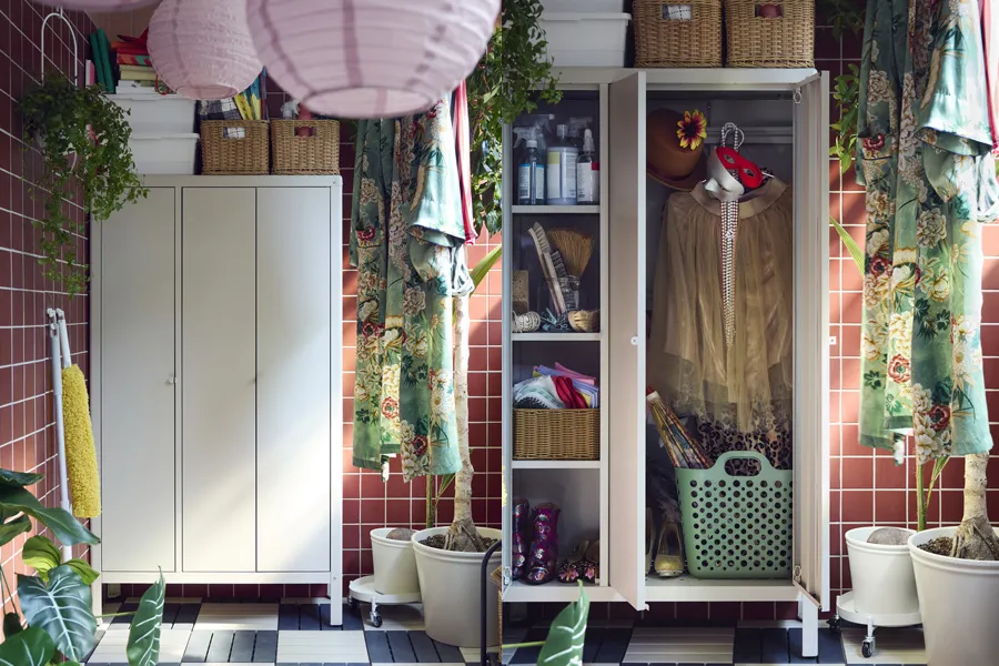 即便是小角落,高效率的KOLBJÖRN收納櫃也能讓你的陽台放大又有型,收納櫃必須堅固、實用而且不失體面,首先需要足夠的分門別類功能,像是清潔用品瓶罐、被單等分層儲藏,長型物品、可吊掛衣物一起管理。善加利用牆面高度也是聰明收納必修,不必受限於地板尺寸。 最後加入陽台好朋友FEJKA人造盆栽,用一抹綠點亮小空間的活力與休閒氣氛。