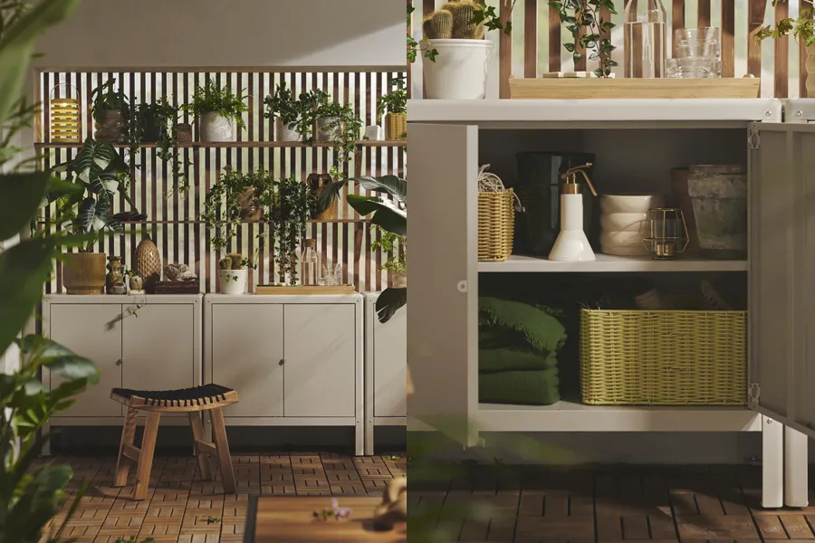 IKEA提供各式儲物櫃和層架組,不管是儲藏室或是前後陽台,都是你最好的收納空間,擺放各式五金或園藝用品,將陽台打造成空中花園也沒問題。收納櫃和長凳有些具有輪子設計,移動更方便。