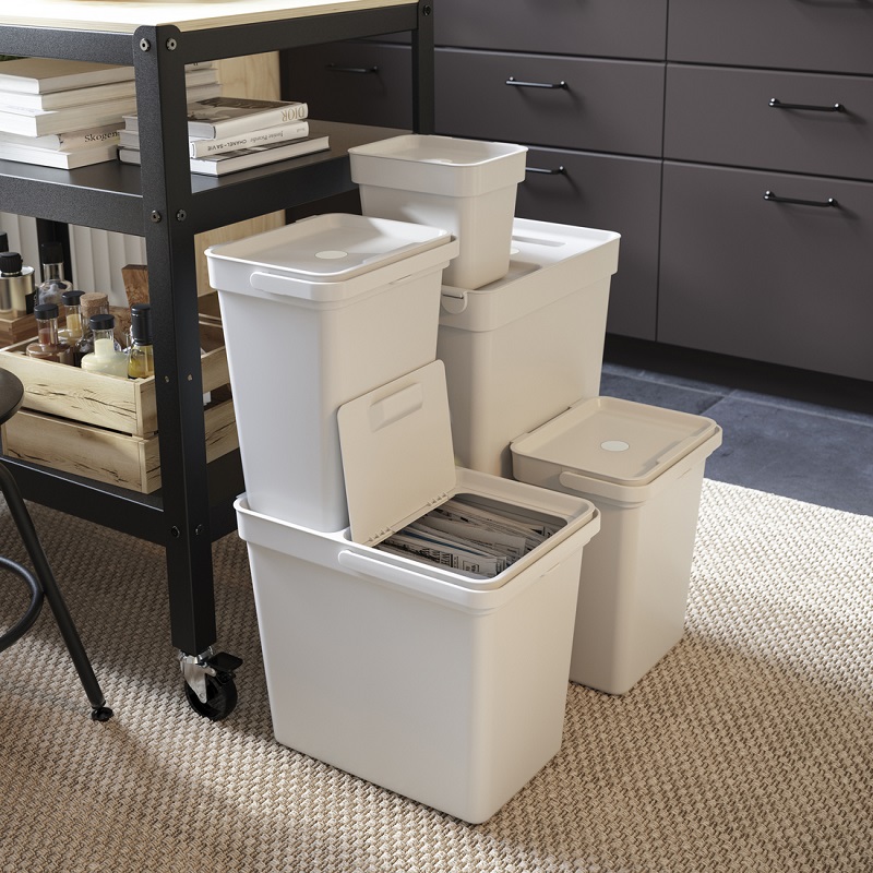 全新的DAMMÄNG垃圾桶為你的垃圾提供了一個特別的終點。可堆疊式的垃圾桶能幫你節省空間,外觀設計也讓垃圾分類區域更能融入裝潢風格。