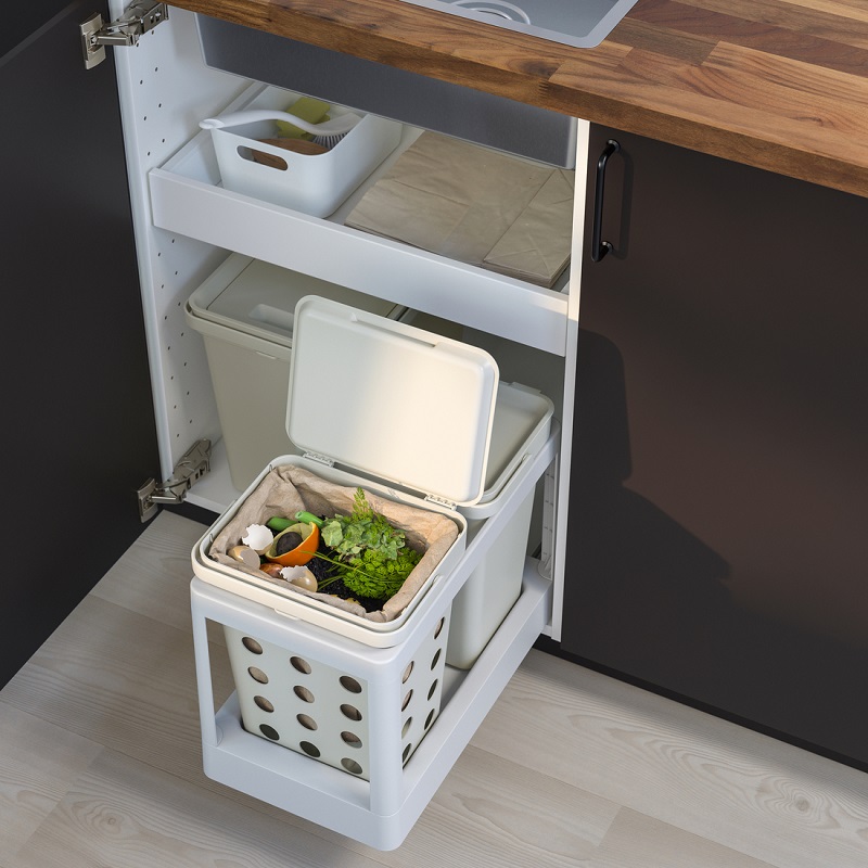 HÅLLBAR 垃圾桶可堆疊,節省空間。可隨意將垃圾桶放置於家中任何地方,或集成於櫥櫃或抽屜中。 摺疊式把手方便攜帶至垃圾站。此外,垃圾桶頂邊設有環形設計,隱藏垃圾袋並固定在位。該環形設計可拆卸,方便清潔或不使用時移除。