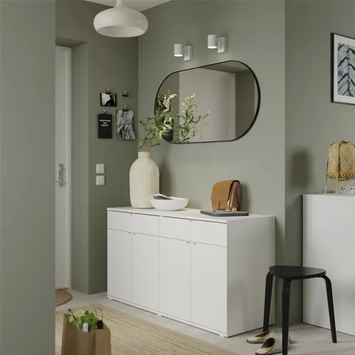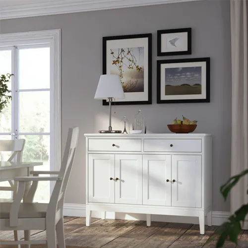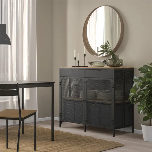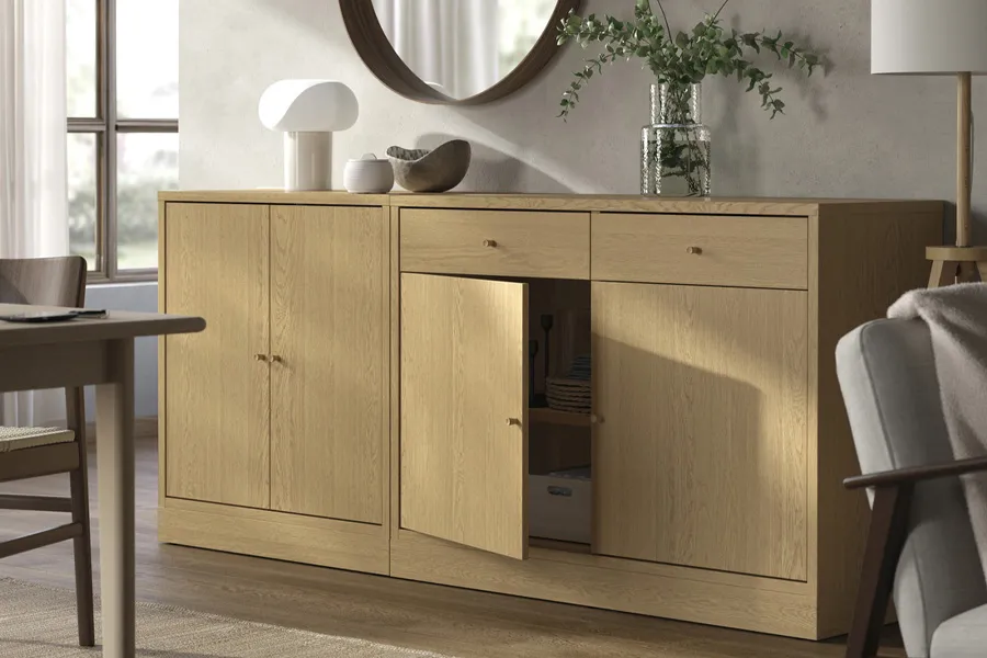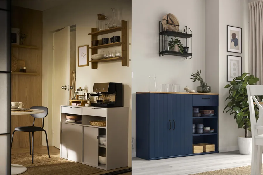 將餐具櫃放在方便取用的位置,無論是餐具、遊戲用品還是居家工作的必需品,都能隨手拿取。同時,收納櫃上方空間也能巧妙運用,擺放你喜愛的收藏品。
