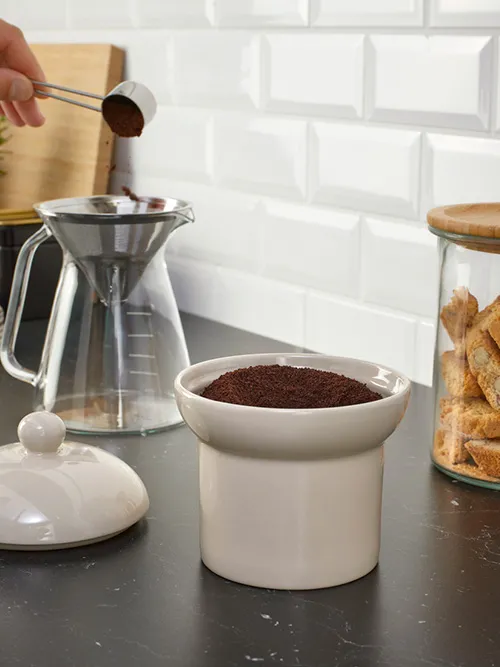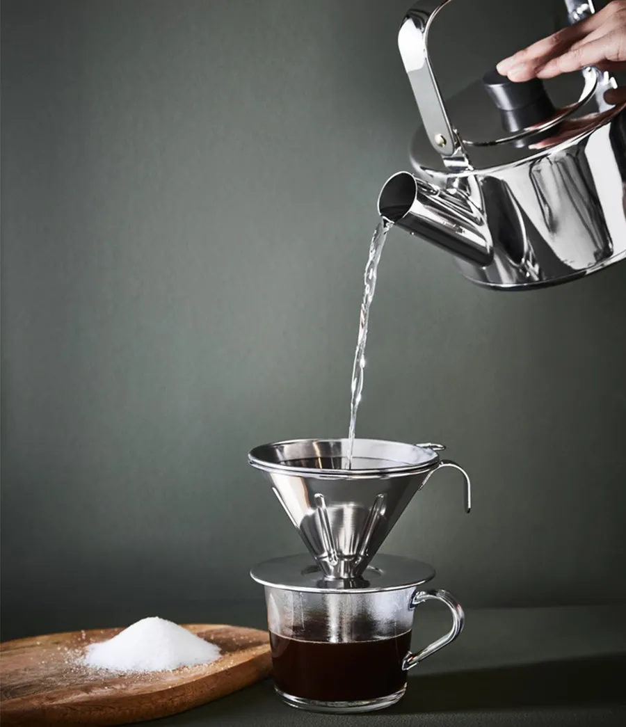 ÖVERST 金屬咖啡濾杯組合可重複使用,鋼質濾網有小孔,讓油脂滴入咖啡,使咖啡味道更加香醇濃郁。