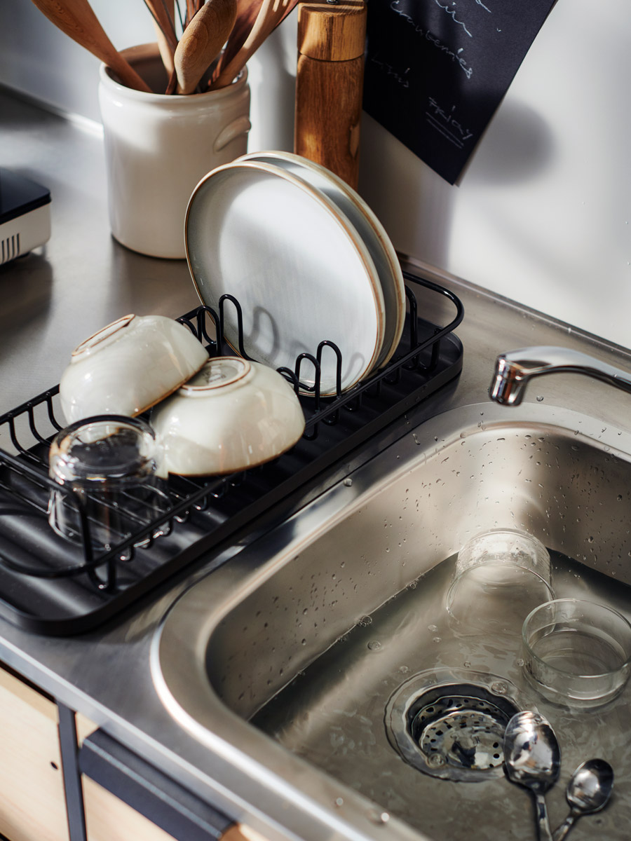 這個碗碟瀝水架可以放置盤子、碗、杯子和餐具。甚至可以在外側固定9個玻璃杯!如果你需要將桌面留給其他用途,這個瀝水架也很容易移動,讓你在物品乾燥時更方便。