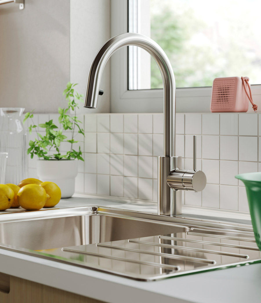 IKEA持續尋找新方法減少家中用水,同時維持良好體驗。所有的廚房水龍頭都配備加氣裝置,將空氣混入水流,保持適當水量又能節水。 選擇外拉或下拉式噴頭,能更精準地將水導向需要的位置,輕鬆掌控水流,減少不必要的浪費。