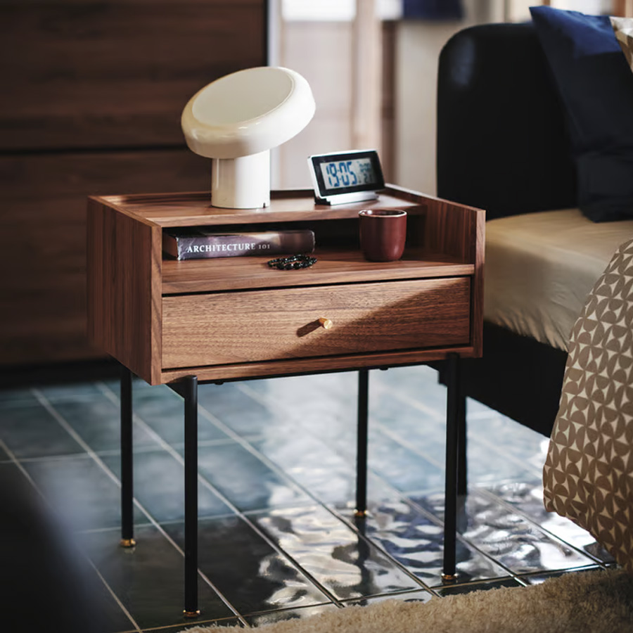 床邊桌靠牆是常態,不靠牆是自信,RÅDMANSÖ床邊桌的自信即是典範,因為它的美完全零死角,洗鍊的線條不分正面背後,溫潤的胡桃木色調不挑空間大小。