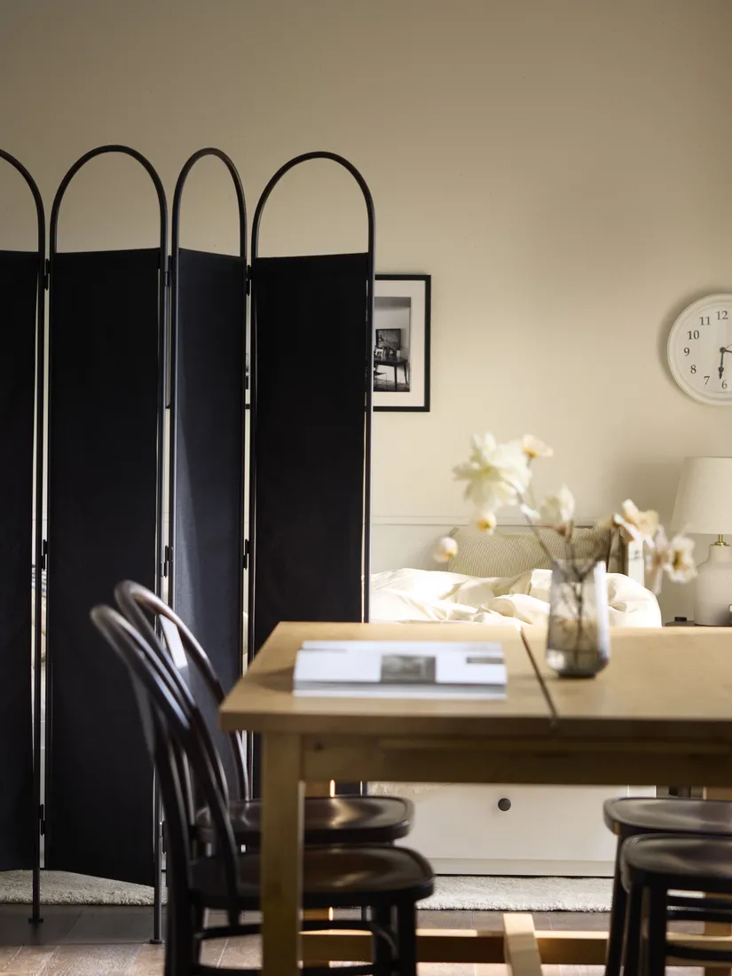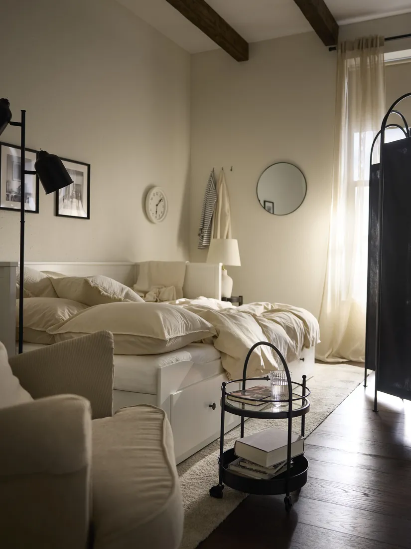 只要聰明解方和一點創意,即使沒有專屬房間,也能打造完美客房。 擺放 GRÅFJÄLLET 隔間屏風,只要幾秒鐘就能創造隱密感,FRÖSJÖN 推車則是絕佳床頭櫃。