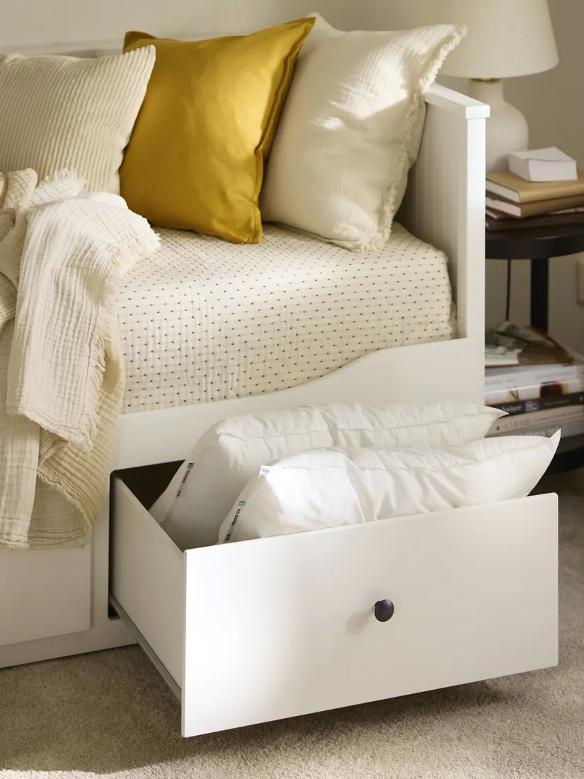 有兩種功能的家具很聰明,那四種功能的呢?HEMNES 坐臥兩用床絕對為你帶來驚喜!輕鬆變成單人床或雙人床,額外的枕頭、床單和被子可收在下方抽屜。現在,你只需要一位好客人!