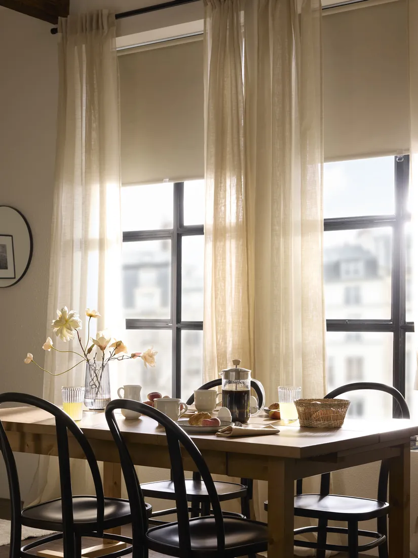 為客廳或餐廳挑選窗簾時,百葉窗可能不是第一首選,但絕對是很好的輔助。尤其是兼作客房的空間,能讓客人迅速調整出想要的亮度和隱私感。