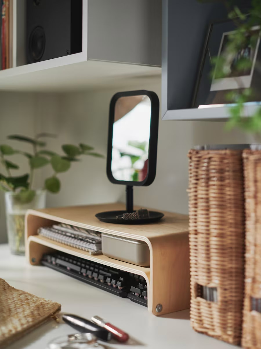 將你的書桌變成客人的梳妝台其實非常簡單。只需將筆記型電腦從支架上拿下來,整齊地放在下面。然後拿起一面小鏡子—就是你在視訊會議前用來檢查儀容的那面—放在桌上即可。