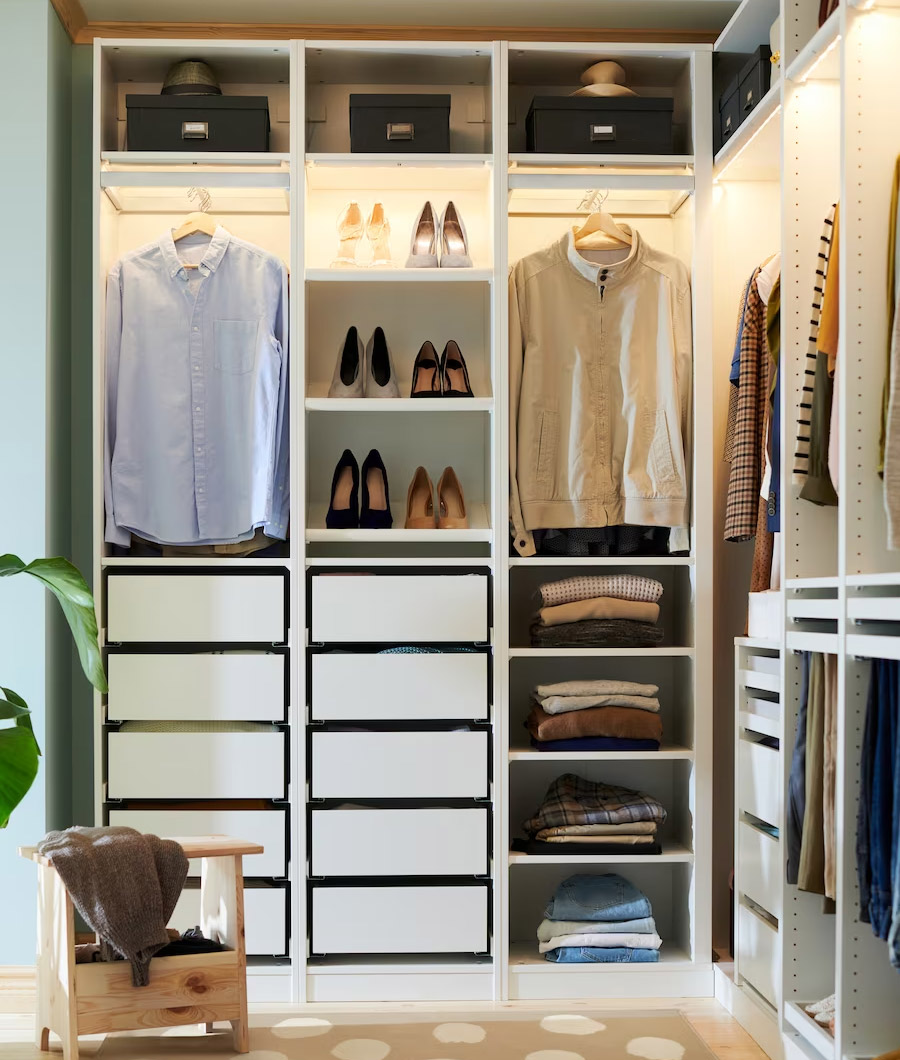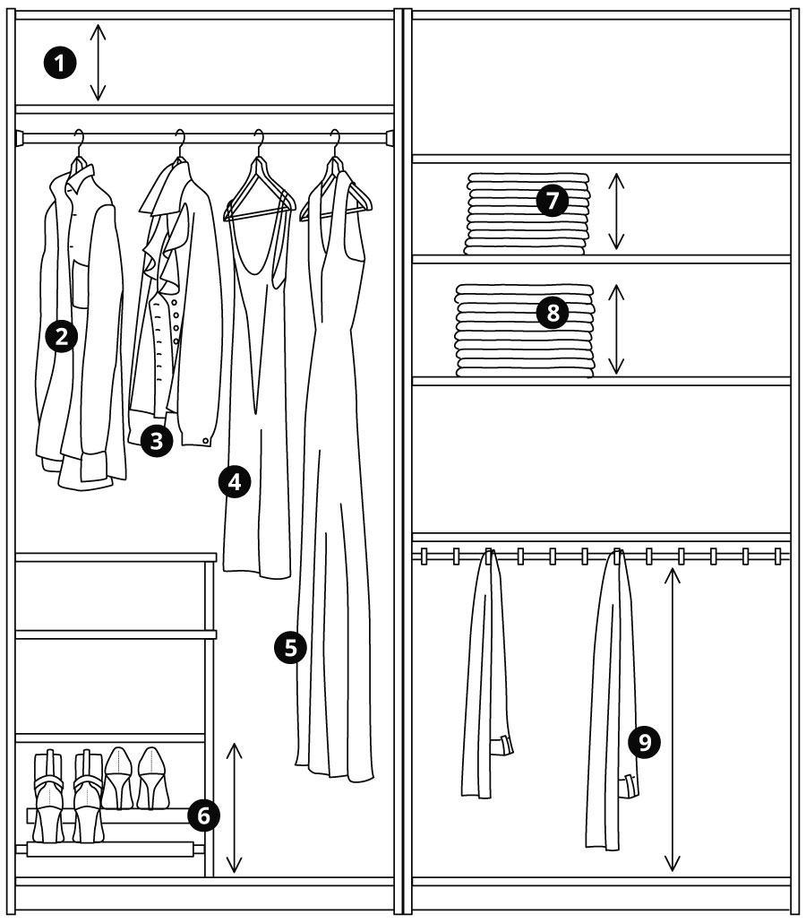 衣櫃的內部間隔和容量主要取決於個人需要。只有你才清楚自己擁有最多衣服的類型,以及理想的收納方式。如果你經常穿T裇和牛仔褲,收納需求與愛穿長裙的人便截然不同。你可能要先把不再穿著的舊衣物處理掉,以便充分利用新衣櫃的空間。