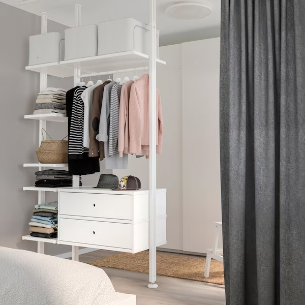 這款輕巧耐用的收納組合使用天花板立柱或側架,輕鬆打造時尚的屏風或衣帽間。可以加入時尚的內部配件訂製專屬組合,例如堅固的抽屜和層架(另有竹材款式)。主要尺寸: 寬40或80公分;高222至350公分(立柱);高216公分(側架);深36或51公分。