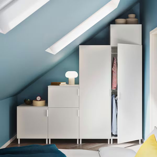 功能強大、靈活且容易組裝/拆卸。擁有多種顏色和風格的門和抽屜面板,始終採用白色框架。適用於傾斜或高天花板的空間。還有支腳選擇,以及互相搭配的床框和電視櫃。主要尺寸:寬度為60或80公分;高度為40、60、120或180公分;深度為40或55公分。門片的類型將影響總尺寸。
