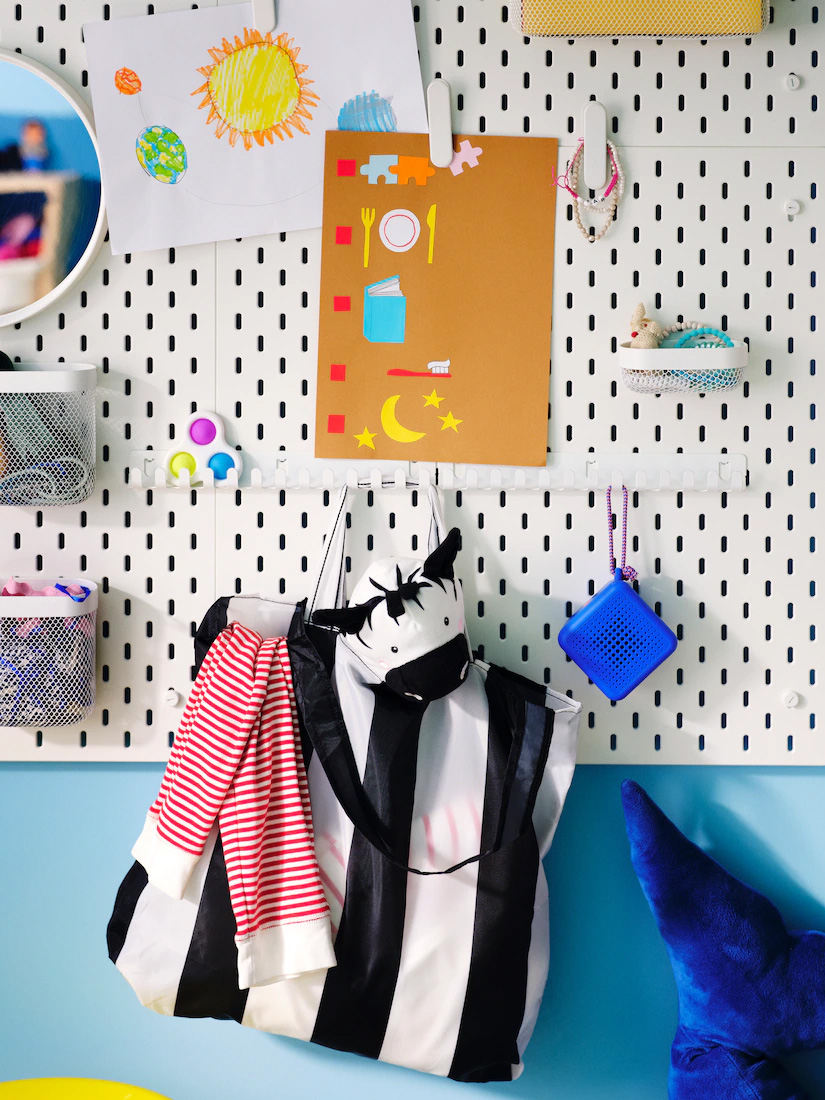 和孩子們一起策劃睡衣派對吧!小主人的心情就跟小客人們一樣緊張。先把所有想做的有趣活動寫下或畫下來:要做什麼?吃什麼?什麼時候該睡覺?把所有想法貼在 SKÅDIS 洞洞板上,就像是靈感聚寶盆,隨時都能預習每一個活動與創意小巧思。