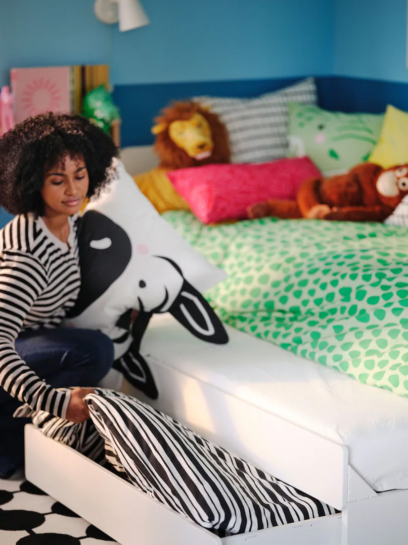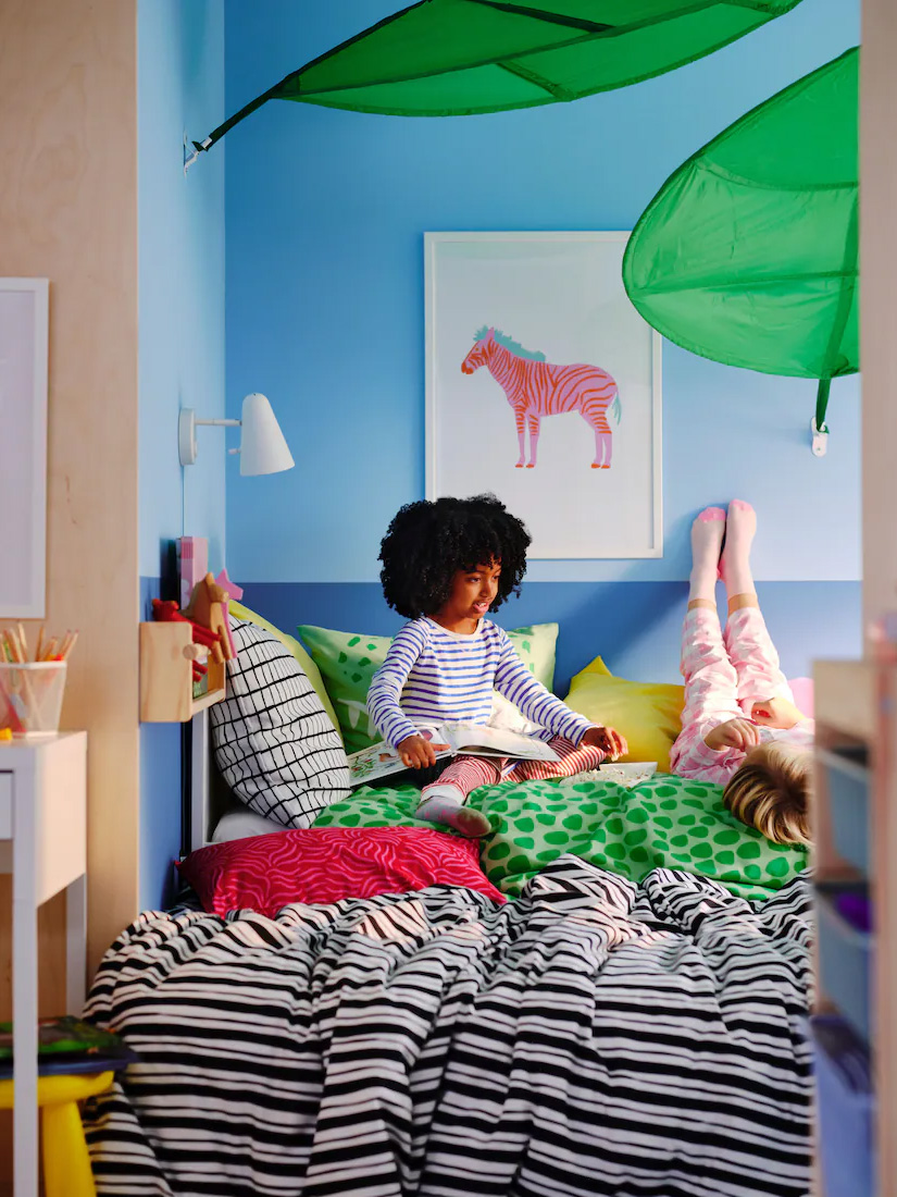 想讓孩子們安靜下來總是很挑戰,記得要預留足夠的睡前儀式時間,幫助孩子好好放鬆、進入夢鄉。拉上窗簾、調暗燈光、鋪好床舖,然後跟孩子窩在一起念個故事~ NATTHÄGER 被套和枕套系列,讓你能輕鬆選到最喜愛的寢具;還有 DJUNGELSKOG 絨毛小夥伴們,為孩子們的美好夢境帶來無窮想像力。