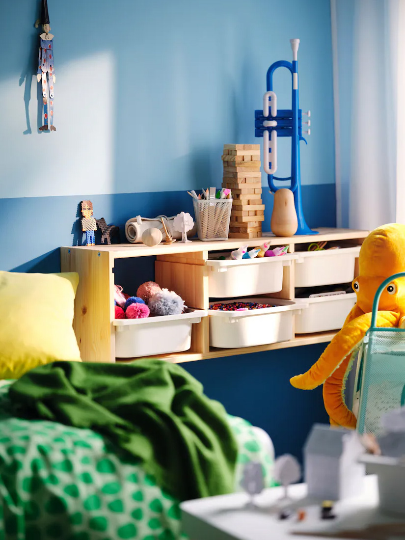 善加利用 TROFAST 收納組合,尤其是能夠完整拉出的收納盒,輕鬆把所有玩具和手作材料都放在眼前。到了該收拾的時候(比如睡覺前~),只要裝滿收納盒、再放回去,房間就重回整齊有序。收東西可能不比拿玩具出來玩那麼令人興奮,但輕鬆快速的收納也一樣能讓孩子們充滿成就感。