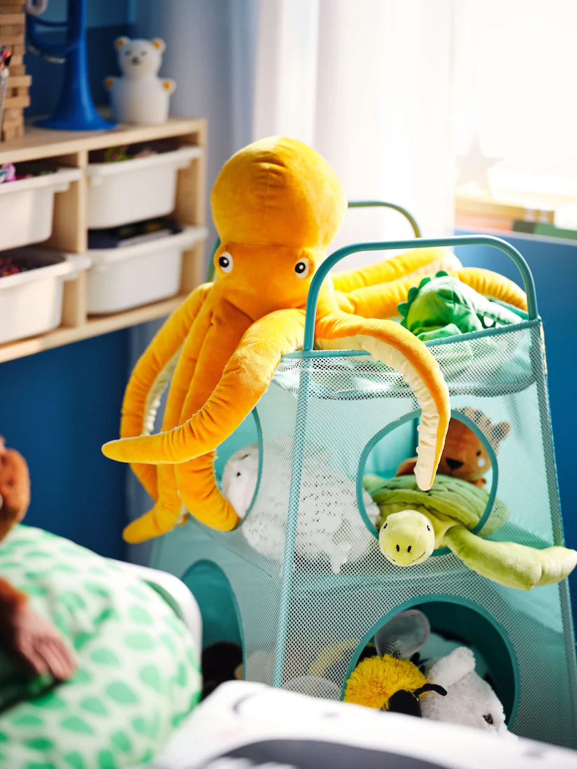 關燈後,孩子有時會感到不安,尤其在陌生的空間,更是會有點小緊張。點亮 TÖVÄDER 夜燈,讓孩子立刻感到自在;在 TIGERFINK 分格式收納組裡擺放許多絨毛玩具,輕鬆移到床邊,讓溫暖柔軟的小夥伴陪著孩子安心入睡。