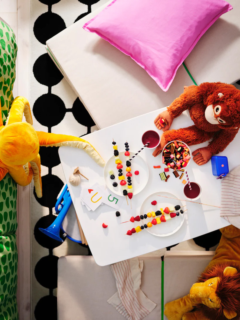 一起烘焙小蛋糕或準備水果串,是孩子們很喜歡的手作活動,也可以試試兩樣都來!完成甜點後,乾脆直接開間咖啡廳~ 放上 SLÄKT 折疊式床墊,讓小客人直接躺在上面休息玩樂,就是超舒適空間!唯一的小疑問:要不要找其他家人一起來玩?如果要,要讓他們當客人還是店員呢?