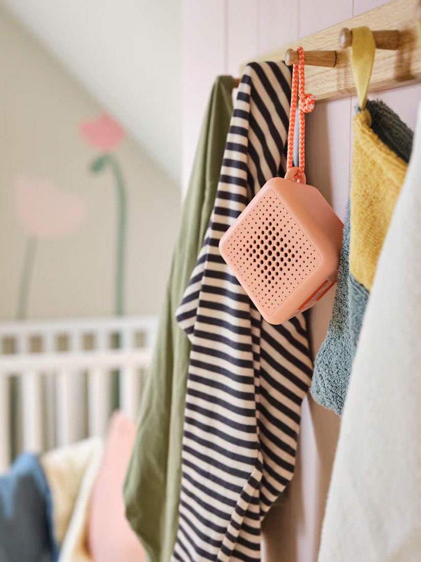 方便帶著走的藍芽喇叭,絕對是好幫手。播放寶寶喜愛的音樂、搖籃曲、輕柔旋律或者白噪音,都能幫助小寶貝平靜,酣然入睡。還能建立起寧靜與睡眠間的正向連結,陪伴孩子安穩成長。