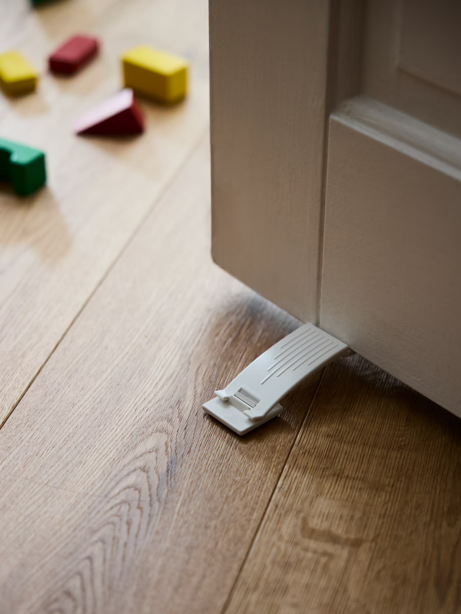 要確保門不會因為有風而突然關上。這個巧妙的小門擋確保門保持打開的狀態,避免孩子的小手指被夾傷。只要把門檔卡在合適的位置便可,而且適用於厚4.5公分以內的所有門。