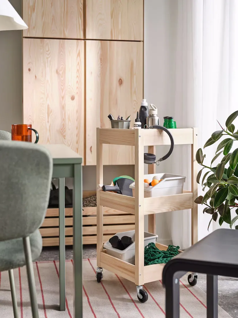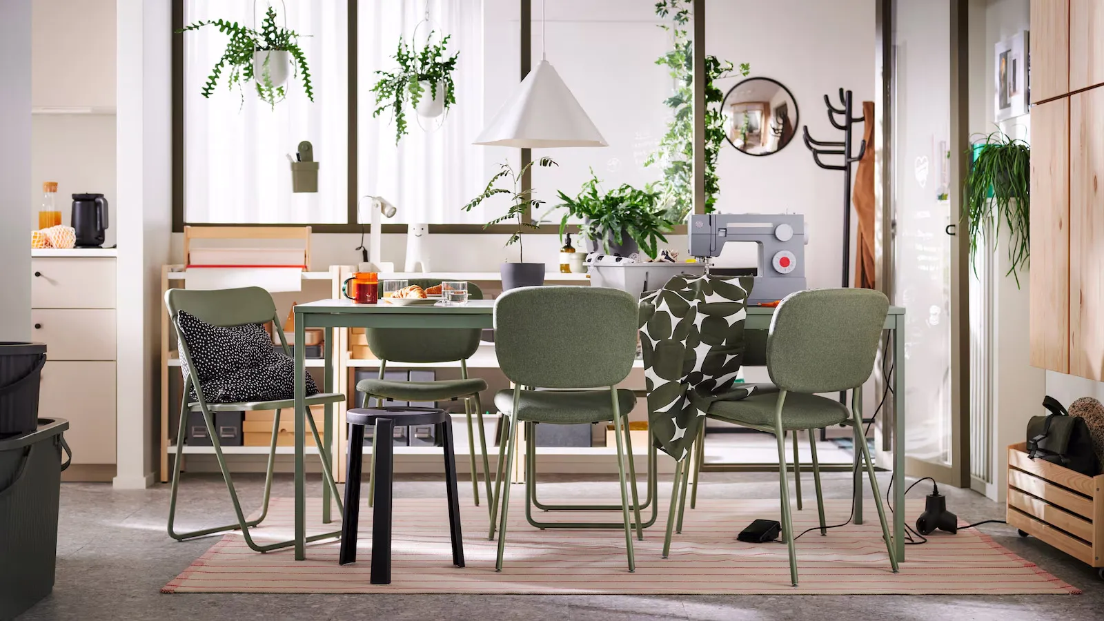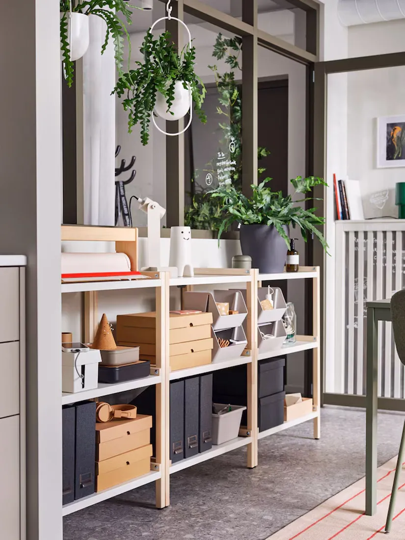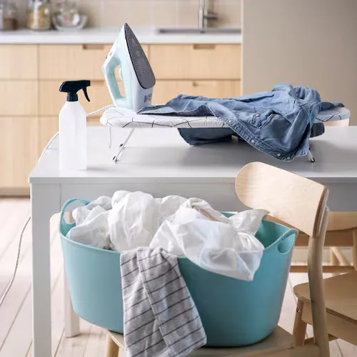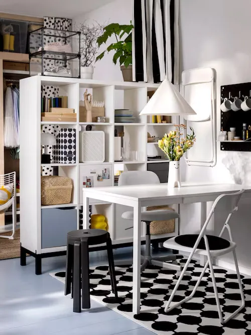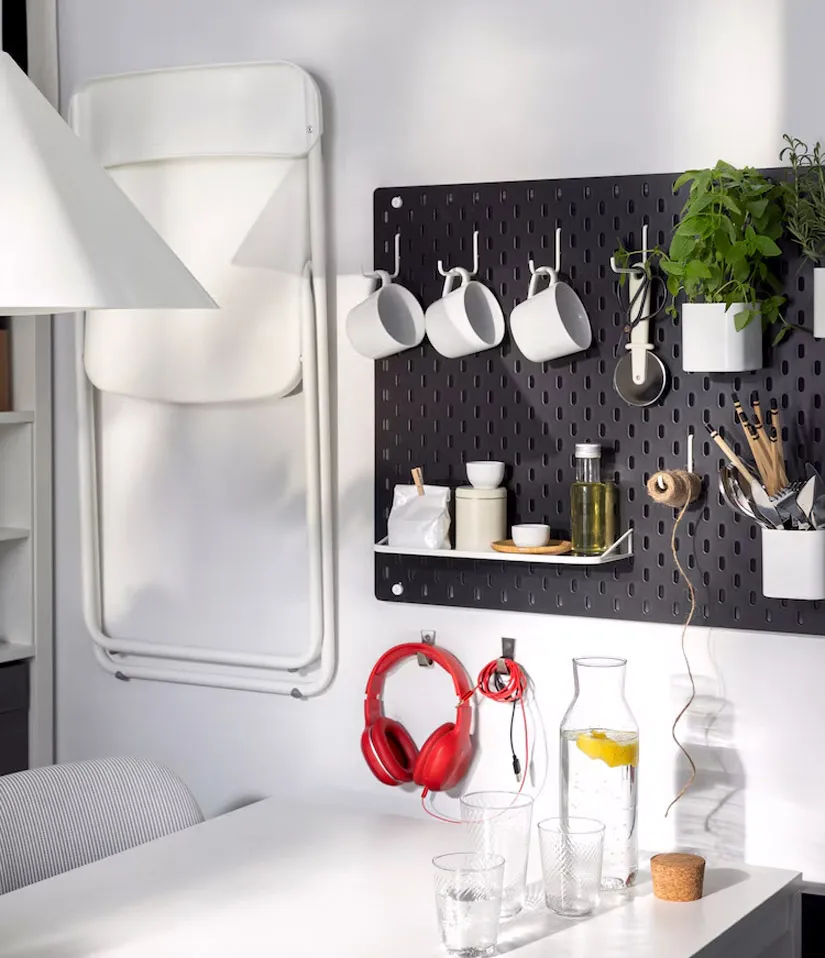 把閒置牆面改裝成收納區,或使用隔間家具,為家創造層次感,也更有效率地利用空間。搭配折疊椅凳,客人離開後收好座椅,空間重回整齊清爽。想燙衣服或化妝?試試 IKEA 的燙衣板和小鏡子,讓你隨心打造你的家。