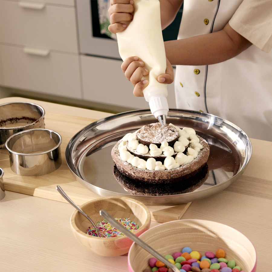 做個美麗的蛋糕哪有什麼難的?尤其廚房裡已經準備好了KAFFEREP冷凍濃巧克力蛋糕、LÄTTBAKAD餅乾模、和SMAKSAM擠花工具組。做出來的成品看著吃著,都是夢幻逸品。